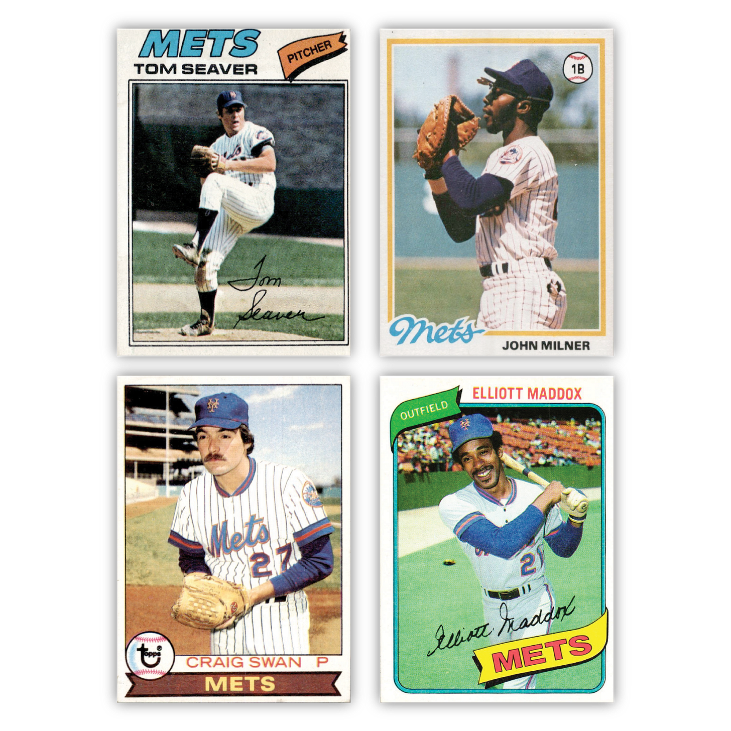 These are some Mets from the 1977-1980 Topps sets. The cards themselves are nothing special – they’re each a pretty simple design. I didn’t think much about it back then, but it’s that simplicity that makes these 1970s cards special. Compare them to ones you buy today. What is the difference? Today, there are like 500 different design elements and holograms and colors all fighting it out on the front of the card. But that’s just my opinion – obviously collectors today like the pizazz, and it sure sells like hotcakes. But to my humble aesthetic, the whole point of the card – the player image, the player’s name, and the team – is often lost in the Stalingrad-esque battle for front space dominance today.