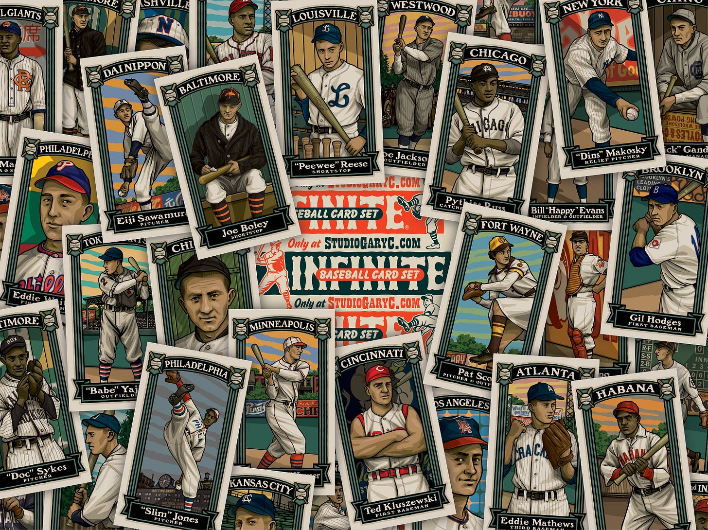 I had no idea I was nominated, let alone that I was even worthy of such an honor. I’ve just always kind of gone along and done my own thing, telling stories of baseball’s forgotten characters and using the baseball card as a way of expressing it. The card set I created, The Infinite Baseball Card Set, is a set in name only. There is no fixed number of cards. There’s no rhyme or reason to the players I cover. Most of the “cards” only exist on my website. They’re of an odd dimension that bucks the standard 2 1/2 x 3 1/2” trading card size. Heck, I don’t even number the cards, nor do I know how many I created!