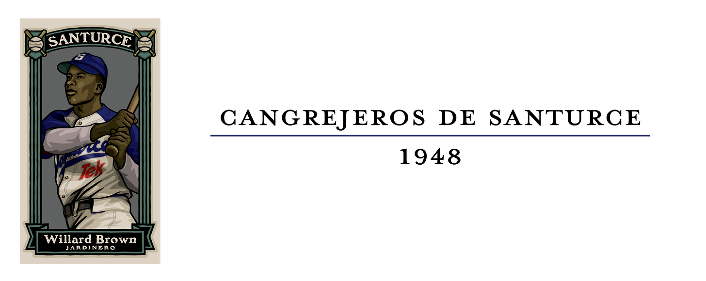 The final uniform and team I am considering is the 1948-49 Cangrejeros de Santurce. Upon its formation in 1938, the Puerto Rican Winter League became a showcase for Black and Latino players, with Willard Brown among its first great stars. In the 1947-48 season, Willard had one of his greatest seasons ever, batting .432 with 27 home runs and 86 RBI, winning the Triple Crown and the MVP Award. He followed this up the next season by winning the Triple Crown again and his third batting title in four years. He was among the first players elected to the Caribbean Baseball Hall of Fame.